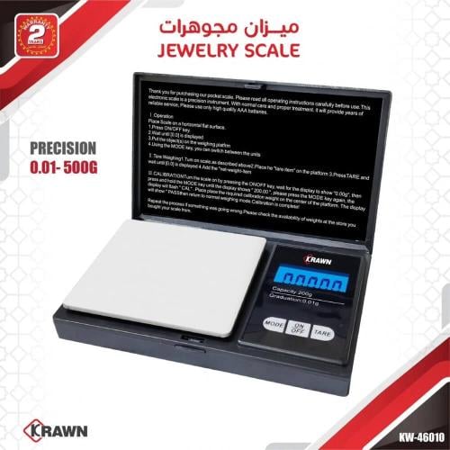 - قدرة الميزان من 0.01-500 جرام: يوفر دقة في القياس حتى 0.01 جرام، مما يجعله مثاليًا للمجوهرات.