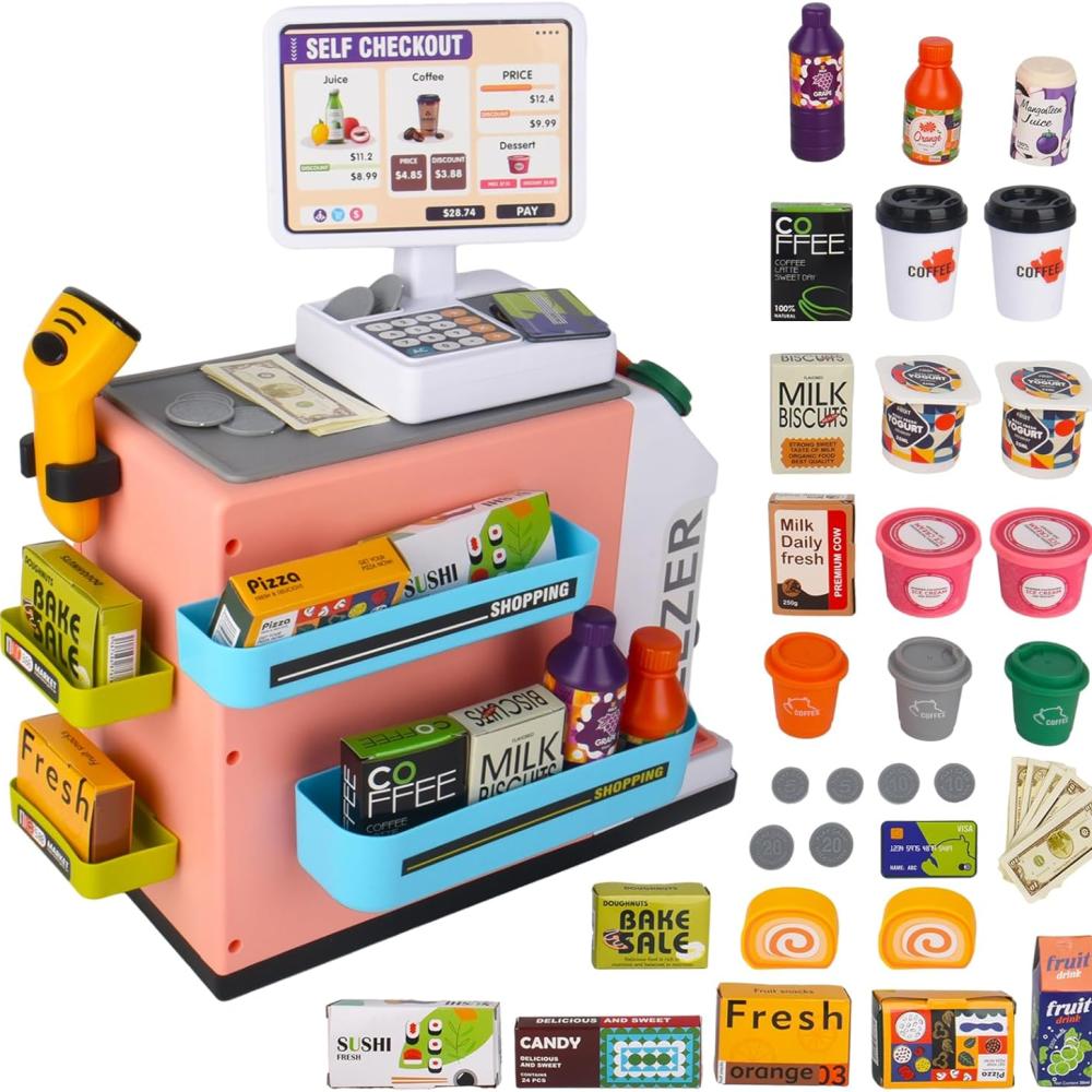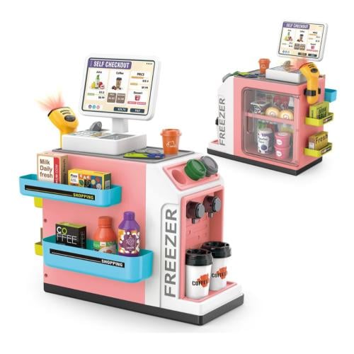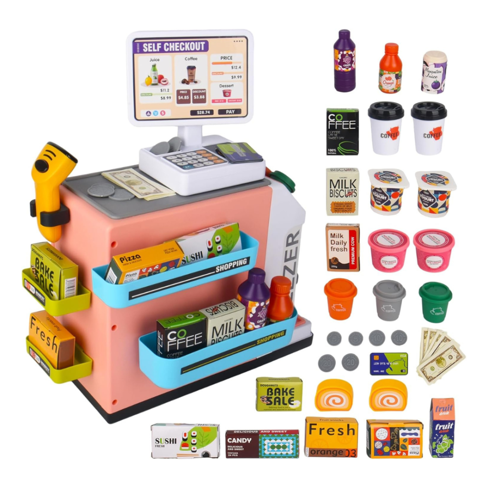 - ملحقات متنوعة: تتضمن المجموعة أطعمة لعب، ماسح ضوئي للباركود، بطاقة ائتمان، أكواب، عملات معدنية، أوراق نقدية، ومريلة أنيقة.